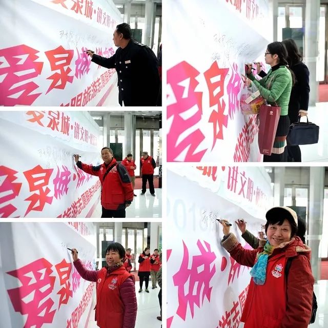 活动开始后,志愿者们拉开横幅,开展了“爱泉城 讲文明 树新风”万人签名活动的第九站,现场的志愿者、中心工作人员、候车游客和市民朋友都在条幅上签下自己的名字,助力文明旅游传播。与此同时,志愿者们积极向候车游客发放文明旅游宣传材料和旅游杂志,宣传文明旅游理念,讲解济南的旅游资源和线路,鼓励大家来到条幅前签下自己的名字。