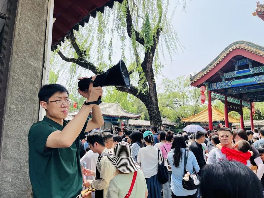 “趵突泉主泉池附近可以说是人流较密集的区域,所以这里的安全、秩序保障尤为重要。”工作人员介绍,假期期间,游客较多,景区根据情况灵活调整入园时间,“三股水”景点处一天下来都可以说是游人如织,为此常常是从早站到晚。不仅是秩序引导,工作人员还得是景区“百事通”,负责解答游客的求助与问题,为此还被游客亲切地称为趵突泉“站哥”。